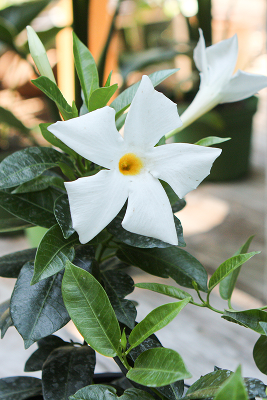 Bride's Cascade Mandevilla features bold white tubular flowers with yellow throats along the branches from late spring to mid fall. Its glossy pointy leaves remain dark green in color throughout the year.