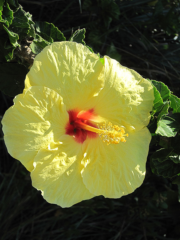 Hula Girl Hibiscus features bold yellow round flowers with red eyes at the ends of the branches from mid summer to early fall. Its glossy pointy leaves remain dark green in color throughout the year.