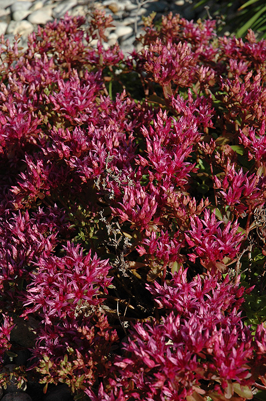 A vigorous perennial groundcover with small succulent foliage which emerges colorful shades of red, eventually fading to dark green; flowers a sea of deep cherry red in summer, spreads rapidly to form a dense low mat; needs a dry and sunny location