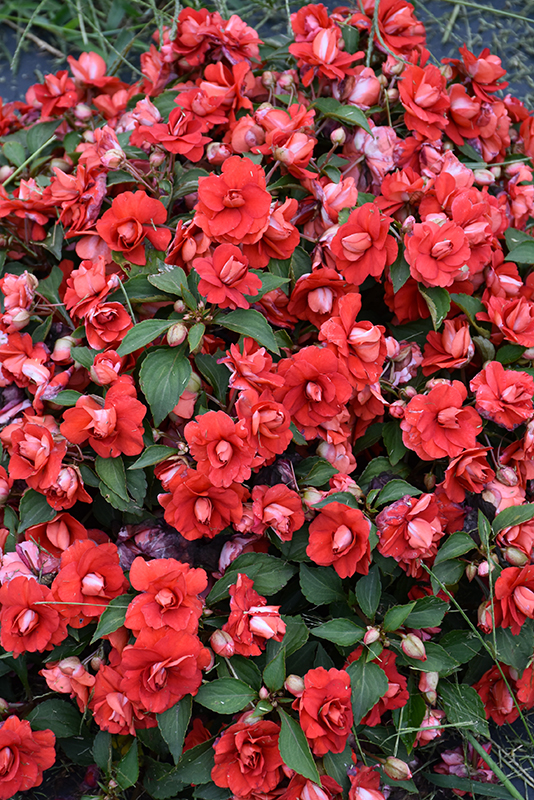 Rockapulco® Red Impatiens is bathed in stunning double red round flowers at the ends of the stems from mid spring to mid fall. Its small pointy leaves remain dark green in color throughout the season.