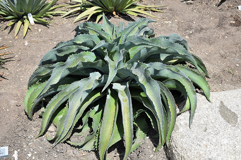 This attractive selection produces a rosette of thick blue-green succulent leaves that cascade downward, with faint spotting and toothed margins; grown primarily for foliage; a great low-maintenance patio plant; must have good drainage