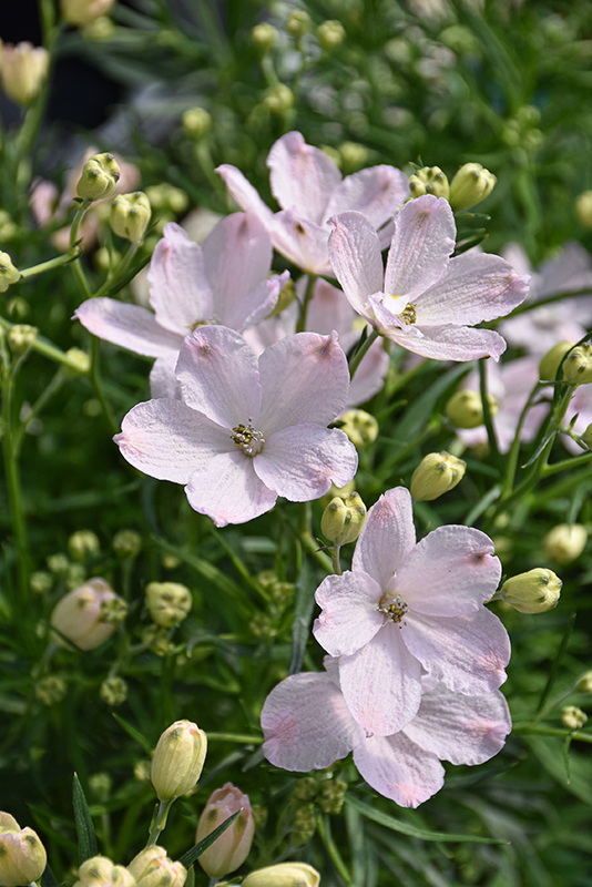 Summer Morning Delphinium has masses of beautiful panicles of shell pink flowers at the ends of the stems from late spring to late summer, which are most effective when planted in groupings. The flowers are excellent for cutting. Its crinkled ferny compound leaves remain dark green in color throughout the season.