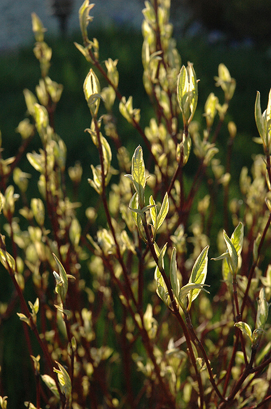 A compact and very hardy shrub, well suited for color contrast in many garden applications; features very showy white-variegated foliage and brilliant red stems which show up well against the winter snow